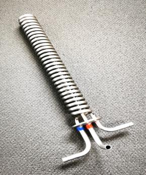 Холодильник Димрота. Выполнен из нержавеющей стали в виде спирали, длина трубки 3000 мм. Полная конденсация паров до мощности 2500 Вт. Соединение - Clamp 1,5". Холодильник предназначен для конденсации поступающих в него из колонны (или из куба, в режиме дистилляции) паров. После конденсации флегма частично возвращается в колонну для ее нормальной работы, а частично выводится в приемник продукта. Пропорции такого возврата/отбора в разных режимах работы выбираются оператором - это разделение потоков и является необходимым условием нормальной работы колонны.